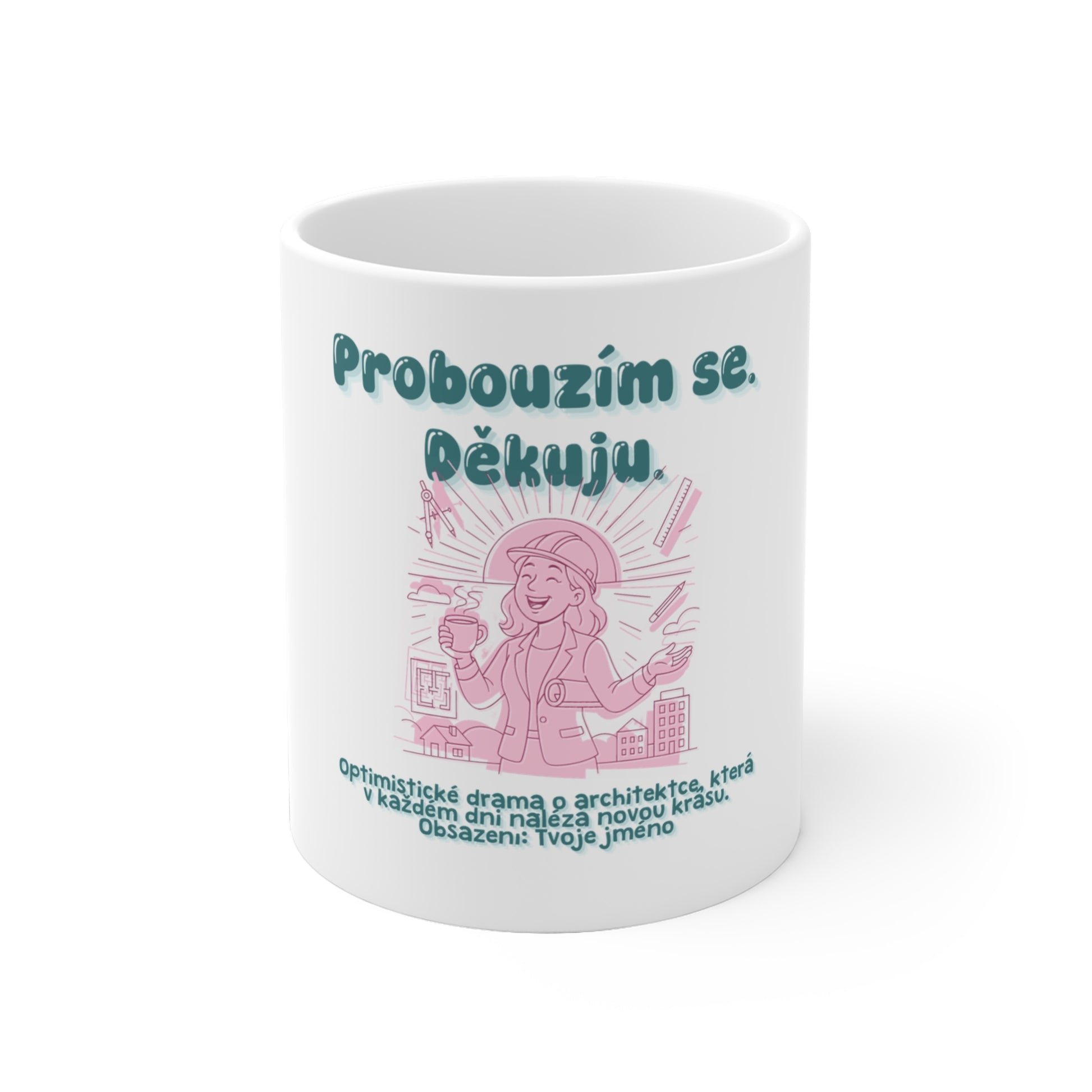 Dopřej si chvilku a staň se hlavní hrdinkou – ‚Optimistické drama o Tobě, která v každém dni objevuje novou krásu.‘ Tento jedinečný hrnek je ideálním dárkem pro každou architektku.