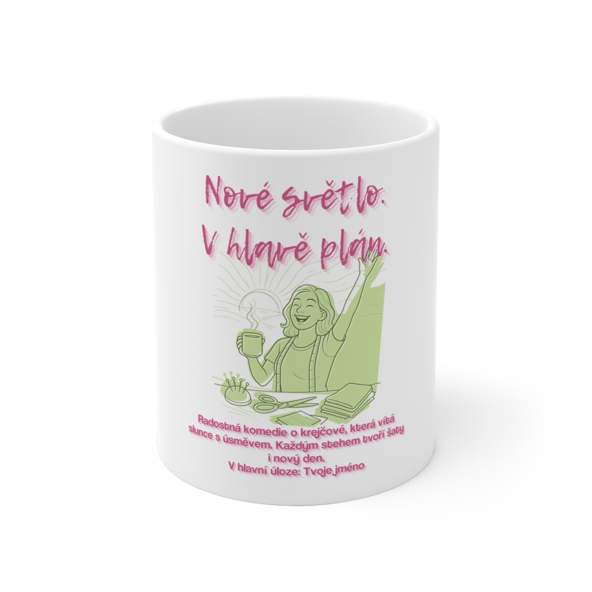 Za oknem se rozednívá, slunce pomalu kreslí první milé paprsky. Tvůj den začíná úsměvem a nitě už čekají na první stehy. Přidej se k naší radostné komedii a staň se hlavní postavou v ranním představení. Dopřej si chvíli inspirace, nech se vést sluncem a užívej si každý steh, švih a úsměv svého vlastního příběhu. Tohle je tvá role, tvé nové světlo, tvůj plán. Tento hrneček pro krejčovou je ideálním dárkem pro každou švadlenku, která si cení krásných začátků dne.