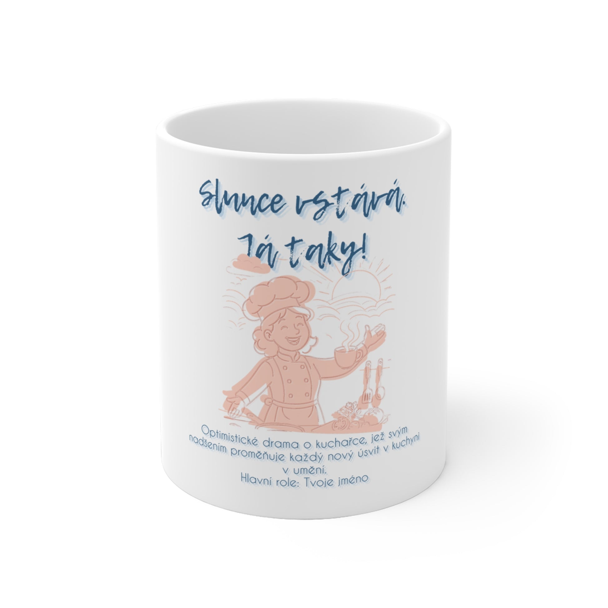 Nad kuchyňským stolem se probouzí slunce, zatímco ty připravuješ ingredience pro nový den plný kulinářských překvapení. Obloha se pomalu vyjasňuje a ty už uměleckými tahy obracíš další list tvého gastronomického dramatu. Staneš se hlavní postavou ve vlastním filmu plném vůní a chutí, kde každý nový úsvit je výzvou. Doporučujeme obsazení: *Tvoje jméno*, premiéra právě začíná! Tento hrnek je ideálním doplňkem pro každou kuchařku v restauraci, která hledá dokonalý dárek k povzbuzení své vášně.