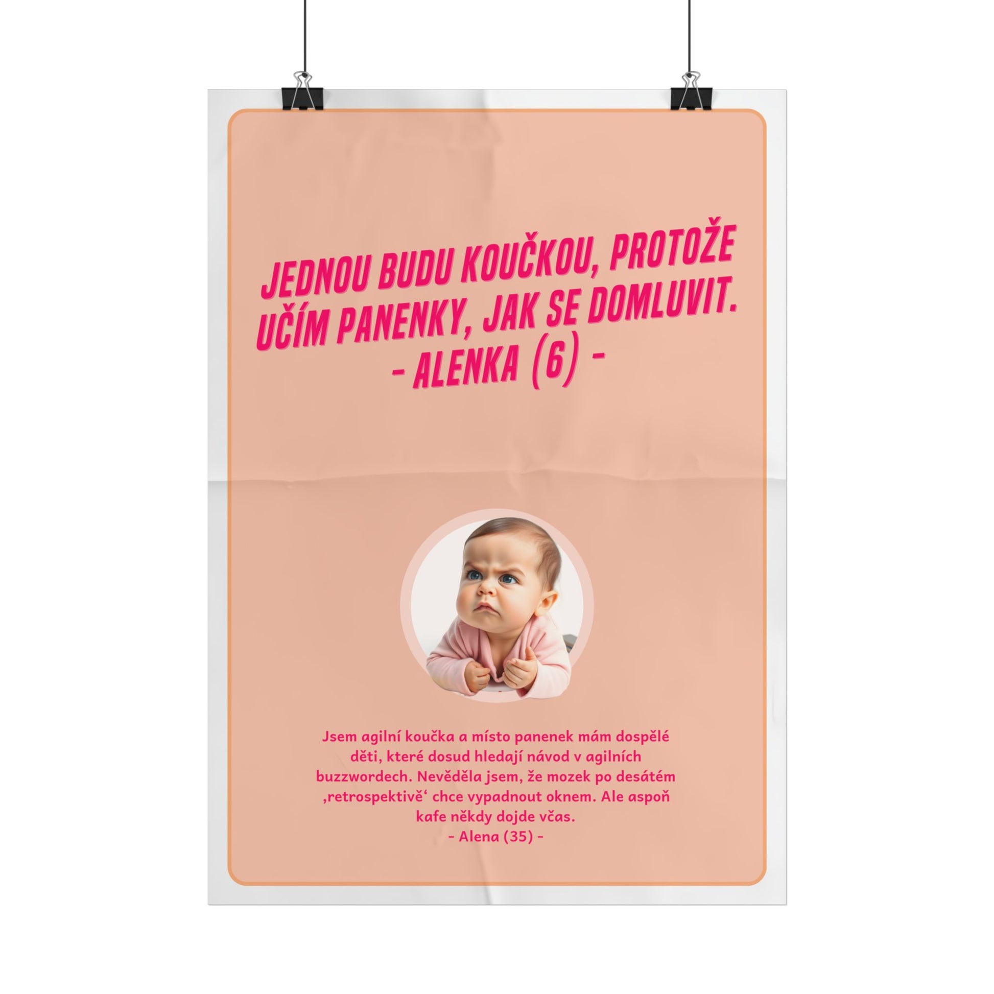 Vracíš se do dětství, kde jsi hrála s panenkami, které poslouchaly a všechno šlo hladce. Ale dnes? Jsi agilní koučka a místo poslušných hraček máš dospělé, kteří chtějí návod ke všemu. Každá retrospektiva je krokem blíž k tomu, aby sis tohle povolání rozmyslela a vzala si panenky zpět. Ještě že aspoň káva dorazí včas, když ne nápady. Tento plakát A3 je ideálním dárkem pro každou agilní koučku, která ocení stylový a motivační doplněk do své pracovny.