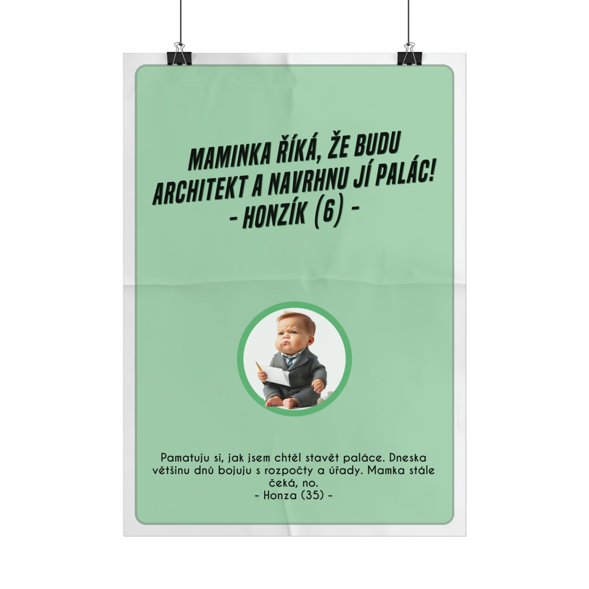 Vzpomínáš, jak jsi věřil, že se staneš architektem a navrhneš mámě palác? Realita je teď sice trochu méně vzdušná a barevná, ale prohlédni si svůj cíl s novou dávkou ironie. Perfektní dárek pro každého architekta, který poznal, jak tvrdé je přistát na zemi s prázdnými ideály a formuláři k vyplnění. Pomoz všem ostatním pochopit, že mezi sny a skutečností je jen malý rozdíl: několik let tvrdé práce. Tento plakát A3 je ideální pro architekty, kteří chtějí dodat svému prostoru osobitý dotek.