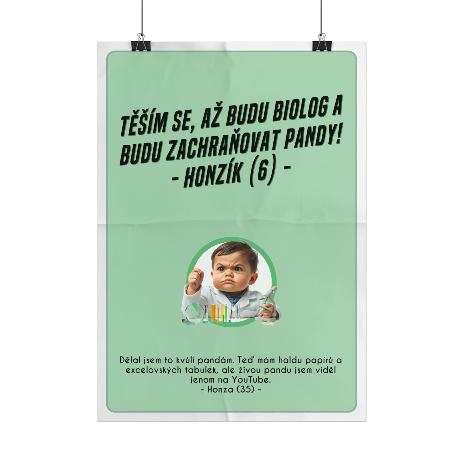 Snil jsi, že se staneš biologem, který zachrání všechny pandy? Bum, teď jsi mistrem papírů a Excelu! Na živou pandu jsi možná narazil jen na YouTube. Tento plakát ti sarkasticky připomene, proč jsi chtěl být biologem, a jaká je realita. Občas totiž nejsou ani vzácní černobílí medvědi tak nedostupní jako tvůj volný čas. Hořkosladká pravda pro všechny oddané přírodovědce. Ideální dárek pro biology, kteří ocení tento jedinečný plakát A3 jako dekoraci do pracovny.