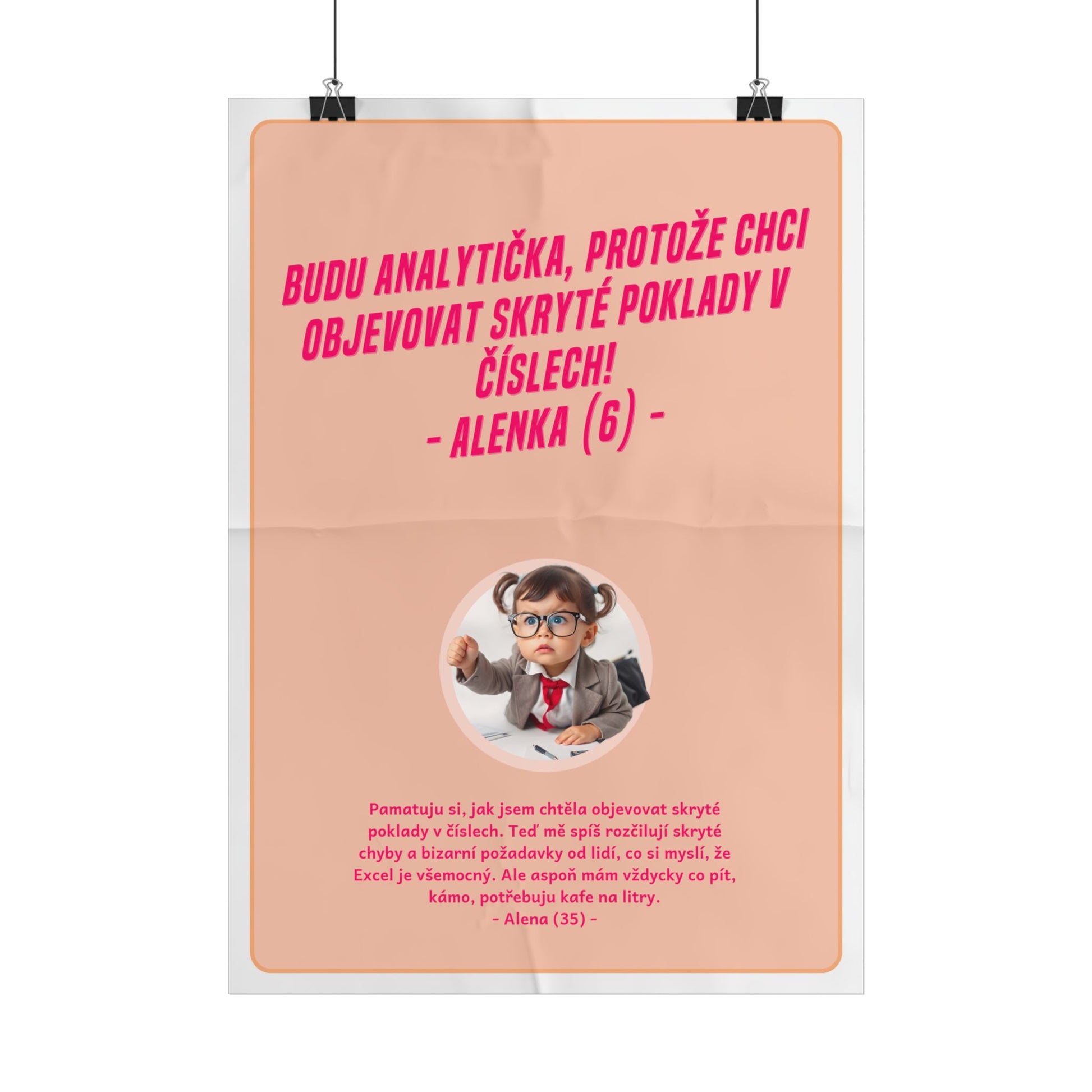 Mládí se zdá být snadné, že? Objevovat poklady v datech a jít do toho po hlavě. Ale pak přijde realita. Nejsou to poklady, ale chyby v Excelu, které se hromadí, a požadavky, které tě donutí zvednout oči ke kávovaru. Tento vtipný plakát A3 ti ukáže, jak se z analytického snu stane kávou poháněná noční můra. A nezapomeň na kávu. Ideální dárek pro byznys analytičku, která ocení trochu humoru ve své každodenní práci.