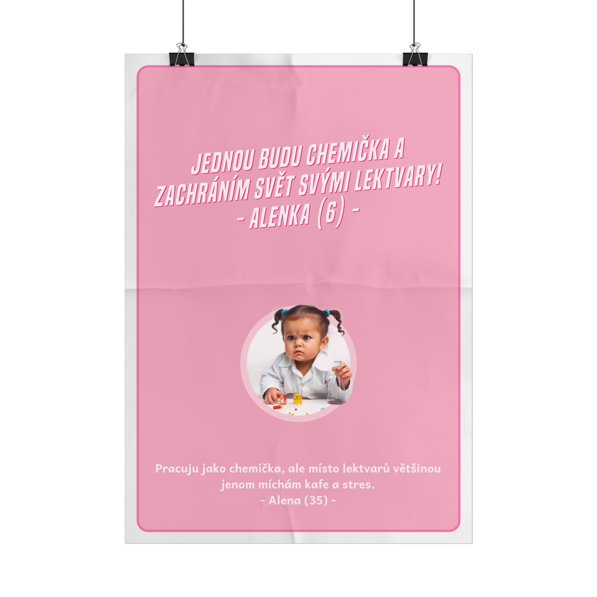Kde se jen ty sny pokazily? Jednou jsi chtěla změnit svět, a teď se snažíš nezbláznit z každodenní rutiny. Tento plakát je hozenou rukavicí do obličeje všem idealistkám, které ztratily iluze v laboratoři plné nervů a vzduchu nasáklého kofeinem. Přidej si do své kolekce kousek s černým humorem a buď královnou pracovního koutku, kde se realita potkává s absurditou. Ideální plakát A3 pro chemičky, které hledají dárek s kapkou humoru.