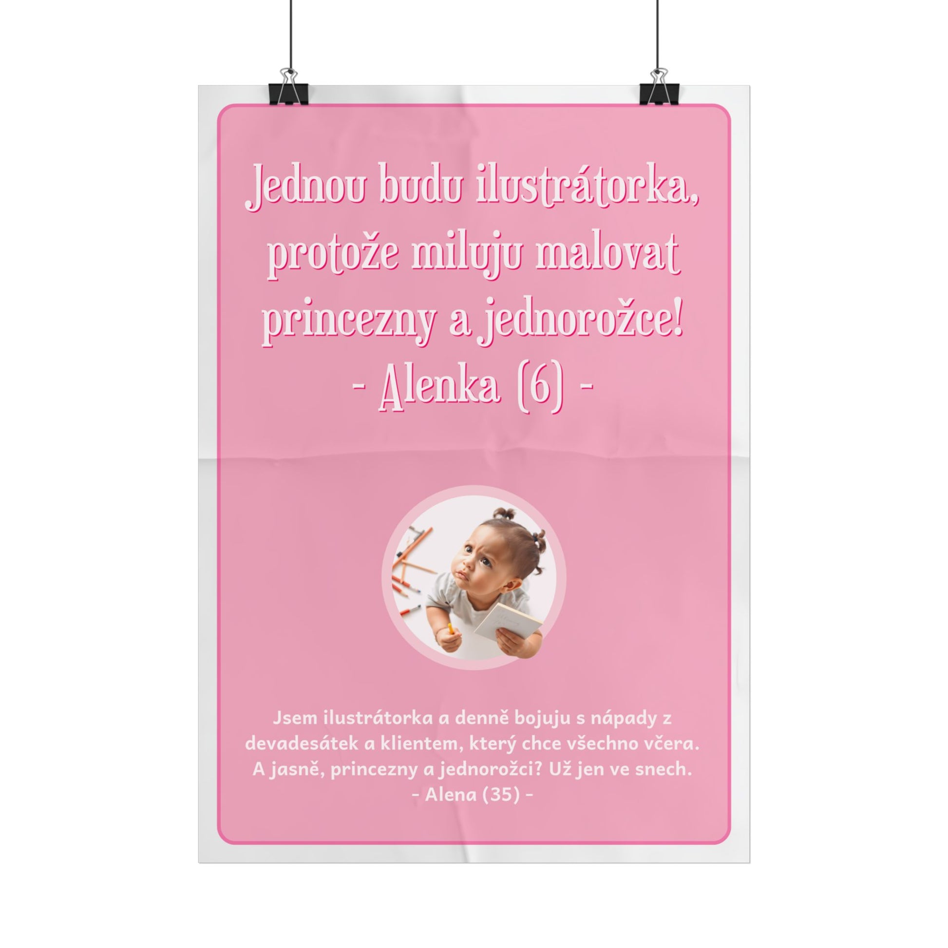 Když jsi byla malá, ilustrátorství vypadalo jako svět plný barev, princezen a jednorožců. Ale dospělost přišla s překvapením – teď bojuješ s klienty, kteří chtějí nápady z pravěku a emaily "včera bylo pozdě". Plakát pro ty, kteří vědí, že iluzí je už jen to, koho vidíš ve snech, a přesto mají paletu stále po ruce! Tento plakát A3 je dokonalý dárek pro ilustrátorku, která potřebuje inspiraci ve světě, kde je tvořivost klíčová.