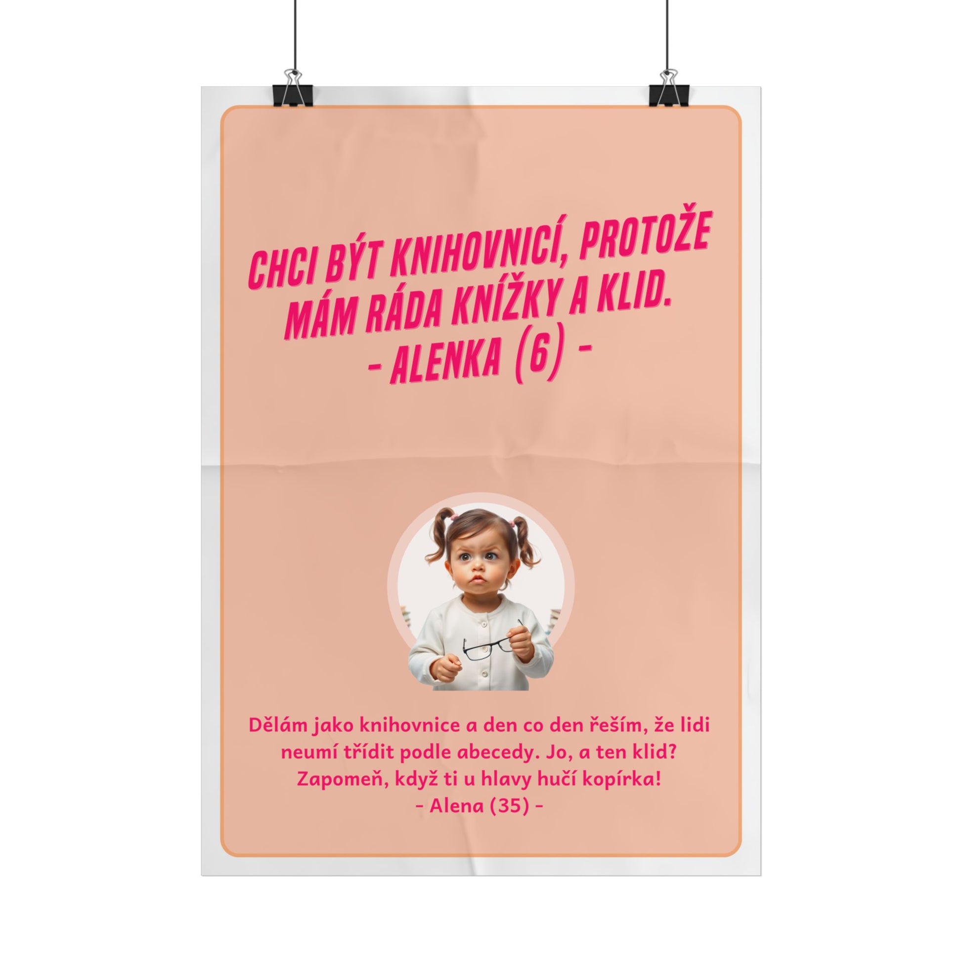 Jste nadšená z knížek a představujete si, že jako knihovnice budete žít v oáze klidu mezi regály? Realita vás ale rychle vyvede z omylu! Místo ticha to praská od zvuku kopírky a vtipů na účet návštěvníků, kteří tápají v abecedě. Tento plakát A3 vám připomene, že i sarkasmus má své místo v knihovně. Rozesmějete se, i když máte chuť křičet. Ideální dárek pro knihovnici, který nejen zkrášlí stěny, ale také pobaví.