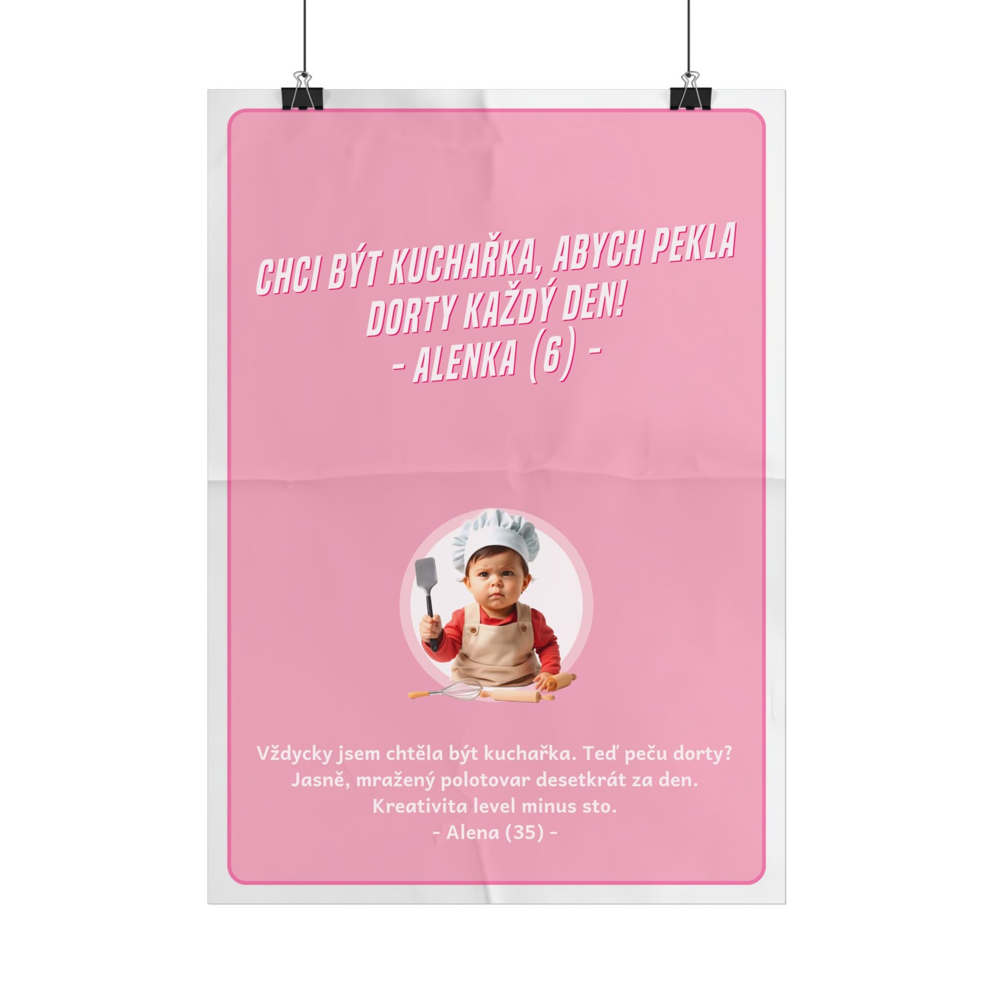 Pamatuješ si, jak jsi toužila stát se kuchařkou a péct dorty každý den? Jak to dopadlo? Teď se ti na lince hromadí mražené polotovary a tvoje kreativita vzala dráhu. Tento plakát dokonale vystihuje rozdíl mezi tím, co jsme si jako děti představovali, a jaká realita nás teď štve. Tvůj vtipný společník do kuchyně, který ti připomene, že i v chaosu je místo pro humor. Ideální plakát A3 jako dárek pro kuchařku, která ocení špetku veselé ironie ve své kuchyni.