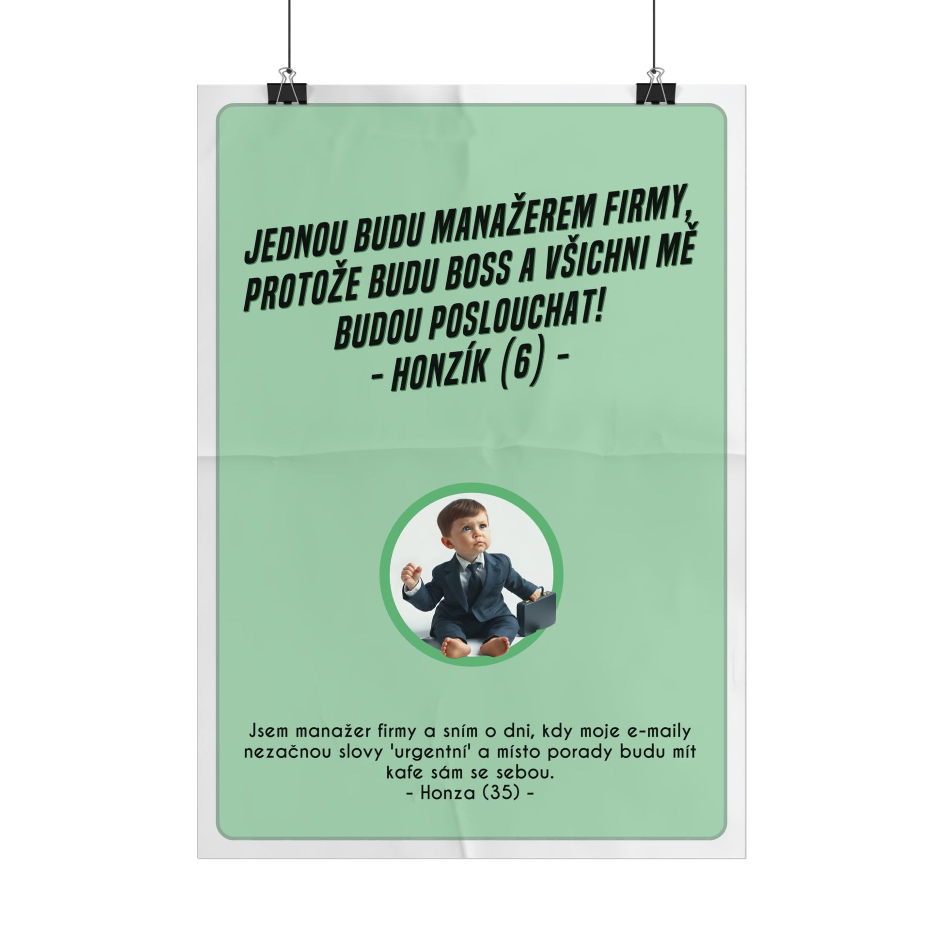 Jako malý kluk ses viděl v obleku s kufříkem v ruce, vidíš ho? Teď na něj zapomeň. Místo toho máš emaily s předměty, které začínají slovem "urgentní" a místo, abys ses cítil jako šéf, tajně doufáš, že jednou si dáš kávu v klidu. Tento plakát ti připomene, že iluze patří do dětského pokoje. Ideální jako plakát A3 do kanceláře pro manažera firmy, nebo jako originální dárek pro manažera firmy.