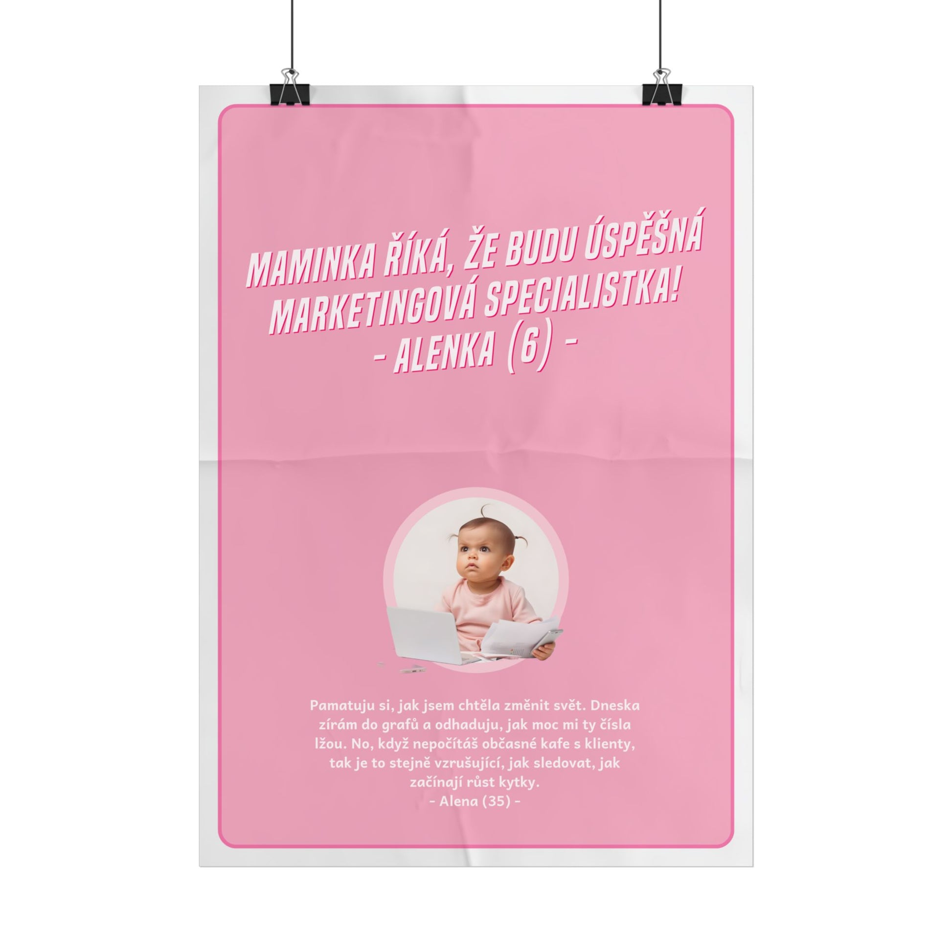 Do reality každodenního snažení o kreativní revoluci vstup s úsměvem – marketingová kariéra může být plná grafů a nevýrazných čísel, kde káva s klienty je občasným vzrušením. Na plakátu ti ukážeme, jak dětské sny narážejí na tvrdou realitu pracovního života. Nakopni svou pracovní rutinu kapkou černého humoru a připomeň si, jak jsi snila o tom změnit svět. Tento plakát A3 je ideální nejen jako inspirace, ale také jako dárek pro marketingovou specialistku.