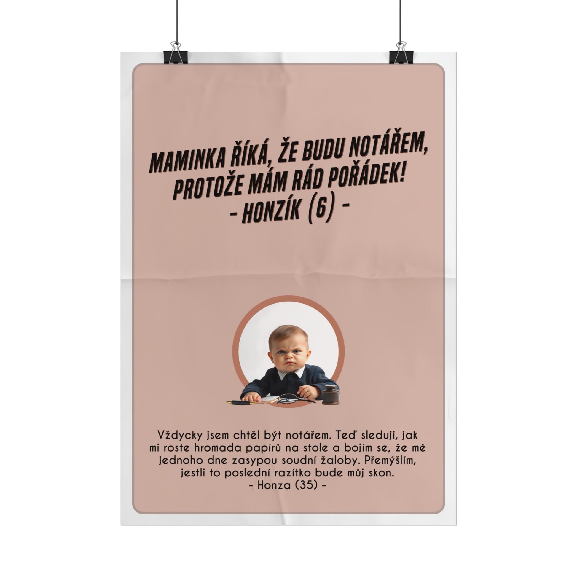 Humorný plakát, který zlehčí těžkosti notářského řemesla. Když maminka říkala, že miluješ pořádek, asi neměla tušení, co tato profese přináší. Nemůžeš uniknout hromadám papírů a soudním žalobám... to je teď tvoje realita. Ať už s humorem, nebo s černou kávou, tento plakát ti připomene, že sarkasmus je tvůj nový nejlepší přítel. Ideální dárek pro notáře, který mu přinese úsměv na tvář!