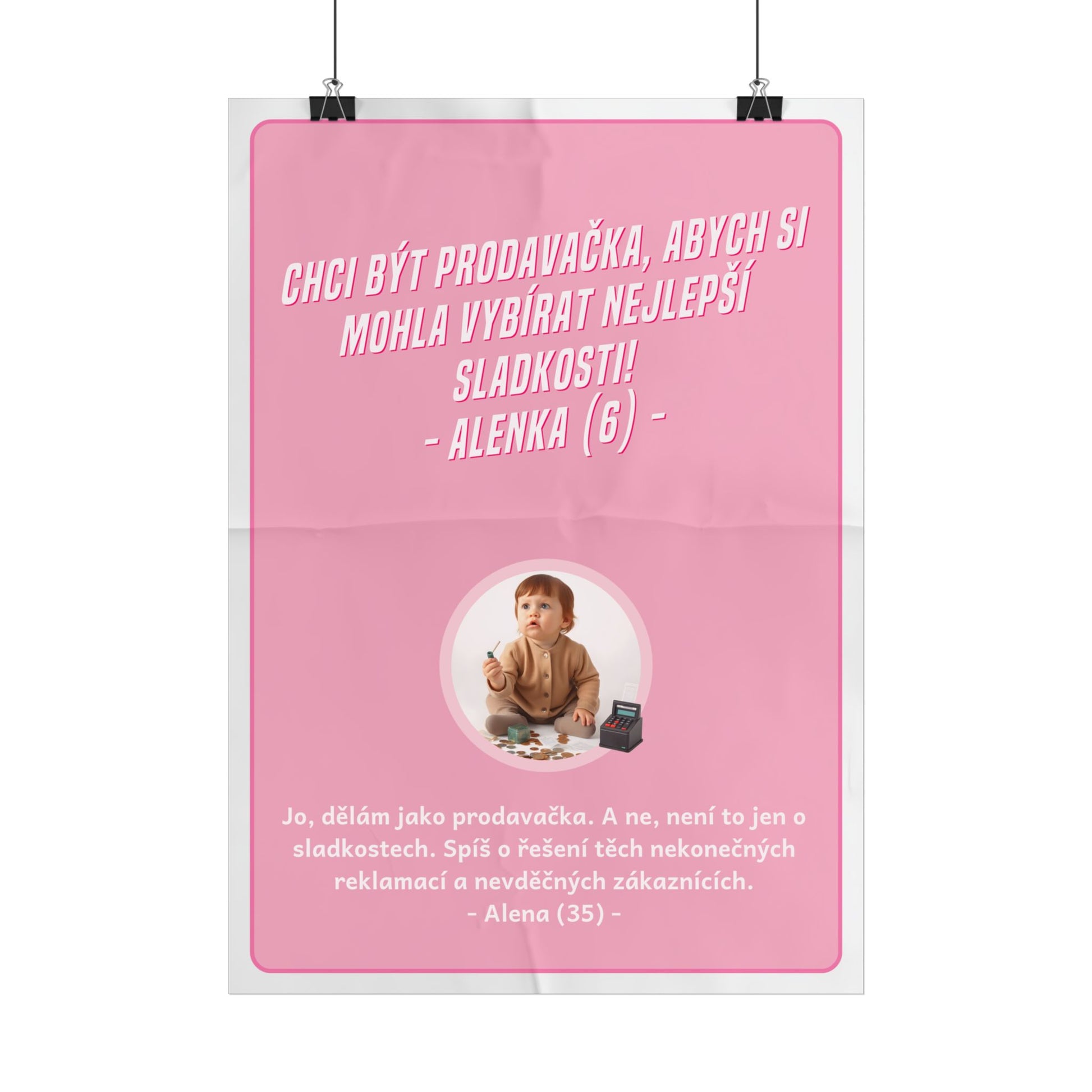 Jako malá chtěla vybírat sladkosti, a teď čelí jedné reklamaci za druhou. Tento plakát působivě zachycuje proměnu naivity v tvrdou praxi! Je určen pro všechny, kdo (nejen) za kasou zažili svižné cvaknutí realitou. Není lepšího humorného připomenutí toho, jak rychle může glazura profesních snů popraskat, než tento sarkastický klenot na zeď! Perfektní dárek pro prodavačku, která ví, jak těžká je práce v obchodě.