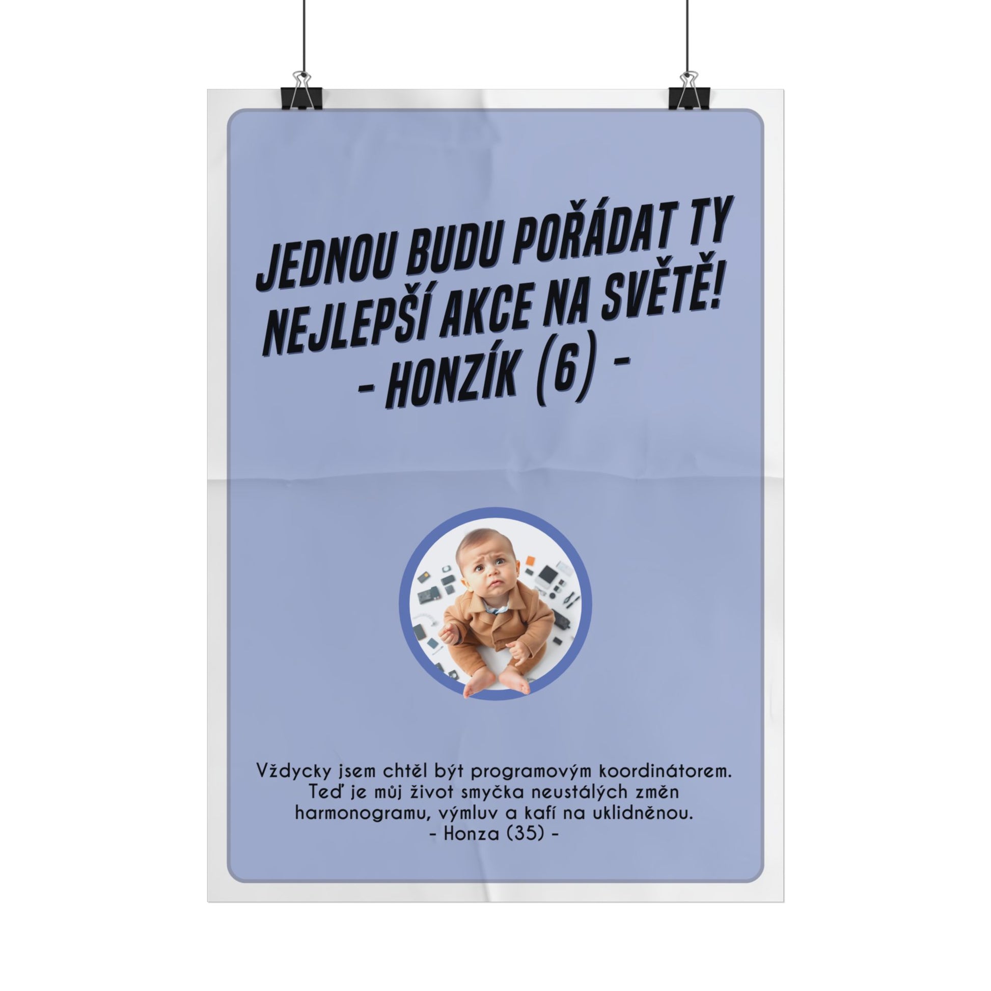 Jednou sis myslel, že budeš hvězdou eventového světa? Realita však zamíchala kartami jinak. Být programovým koordinátorem znamená nekonečný kolotoč chaosu, omluv a hektických kávových přestávek. Tento plakát ti s černým humorem ukáže, že profesní sny a realita se občas rozcházejí větší rychlostí, než by sis přál. Skvělý dárek pro koordinátory se smyslem pro nefiltrující realitu. Ideální plakát A3 pro programového koordinátora, který potřebuje trochu humorné inspirace.