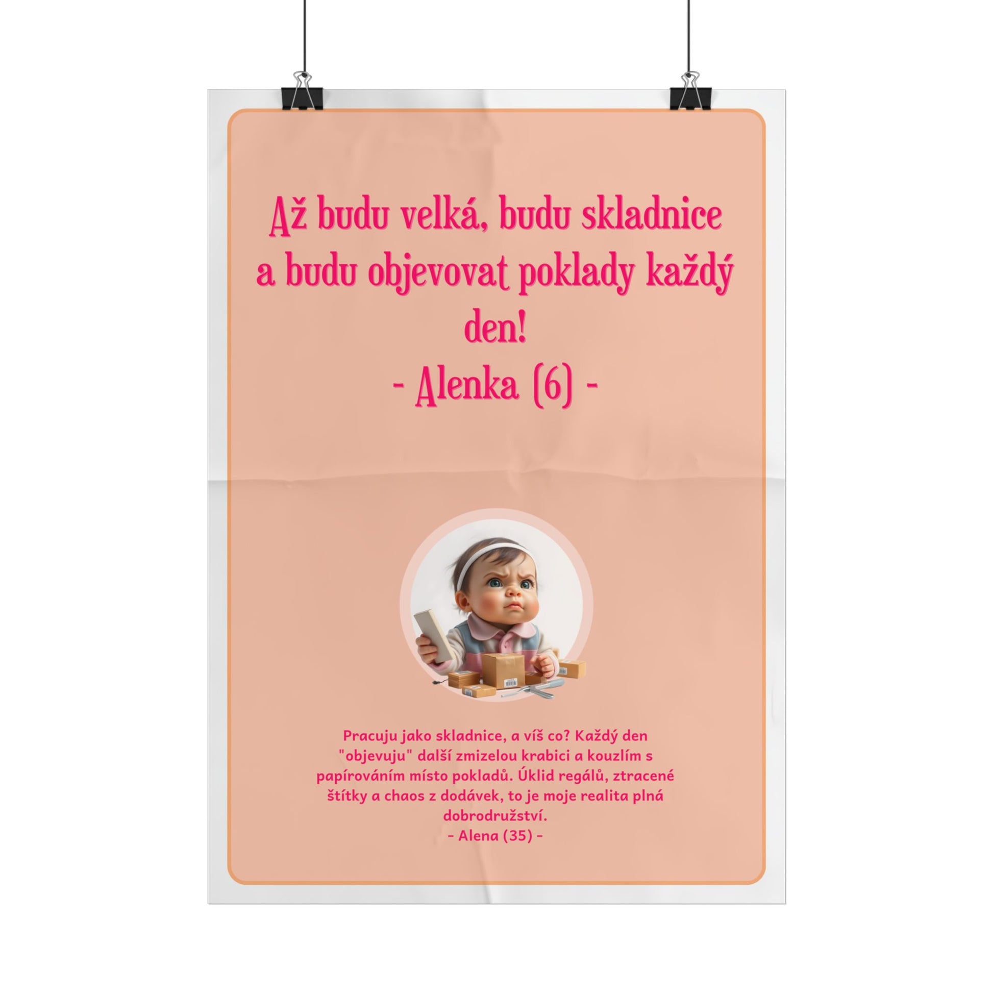Když jsi byla mladá, snila jsi o pokladech, teď se spíš modlíš, aby tato ztracená krabice nebyla TVOJE vina. Tento plakát ti nabízí sarkastický pohled na život skladnice a černým humorem odhalí, jak to vlastně chodí, když místo pokladů čaruješ s fakturami a hledáš ztracené štítky. Připrav se na vystřízlivění ve skladišti, kde je chaos každodenním chlebem. Ideální plakát A3 pro každou skladnici nebo jako dárek pro skladnici plnou humoru!