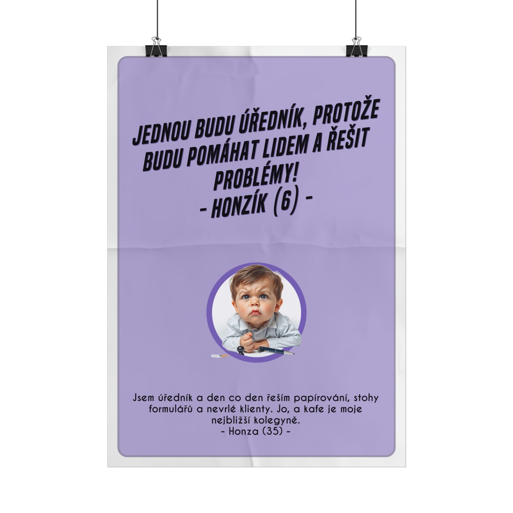 Pamatuješ si tu dětskou nevinnost, když jsi snil o tom, že jednou budeš úředníkem? Časy se mění, kamaráde. Slova jako „pomáhat lidem“ a „řešit problémy“ se nějak proměnila ve „čelím papírové apokalypse“ a „můj kávovar je jediný, s kým si rozumím“. Ideální plakát A3 pro všechny, kteří vědí, že i úředníci mají právo na sarkasmus a černý humor. Tento plakát A3 je skvělým dárkem pro úředníka.