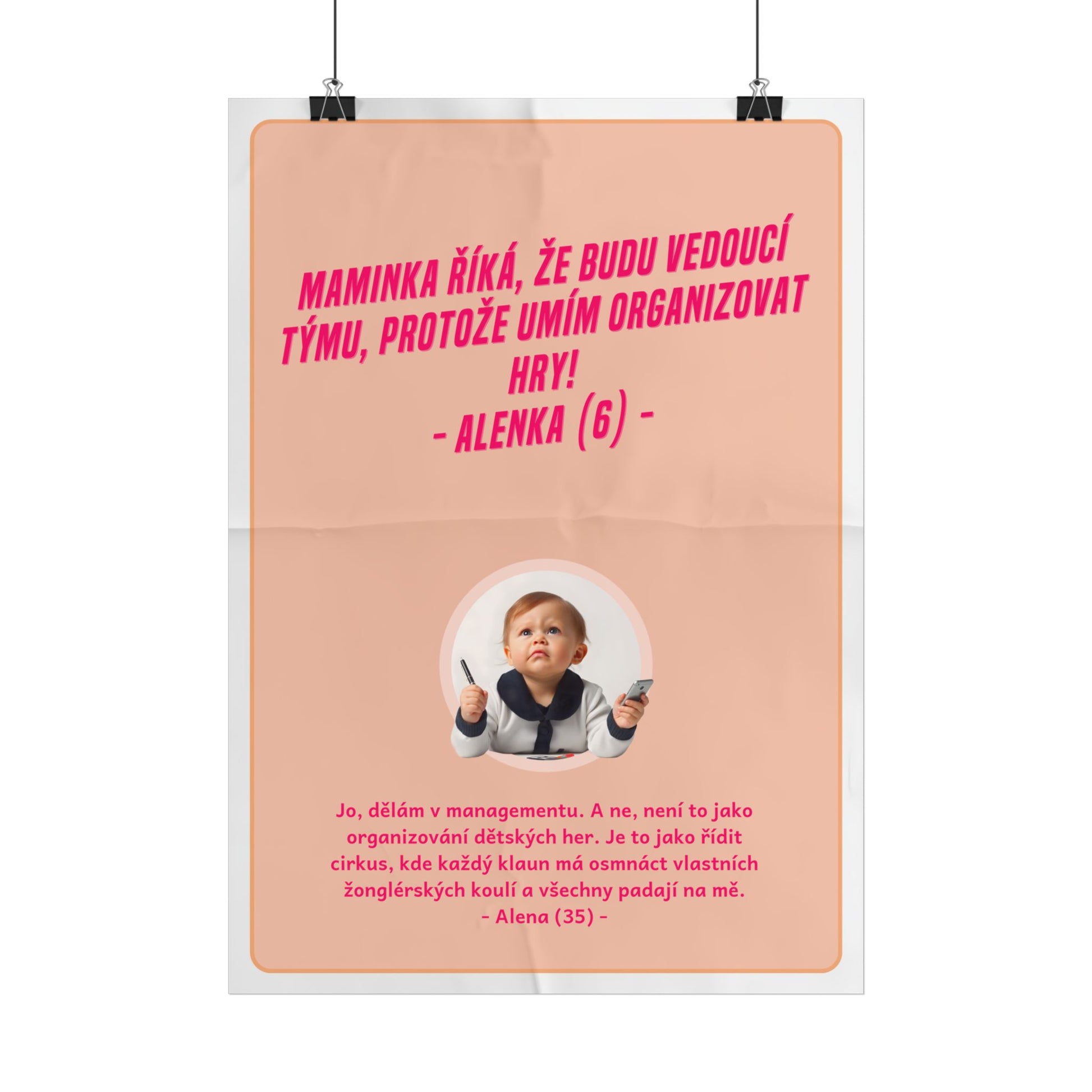 Přemýšlíte někdy nad tím, proč byla maminka nadšená, že z vás bude vedoucí týmu? Dokážete si představit management jako skvělou organizaci dětských her? Tak se probuďte! Realita je spíše řízení cirkusu, kde každý klaun žongluje s vlastním chaosem. Pokud tohle zvládáte, plakát vám připomene, že v tom nejste sami. Ideální dárek pro vedoucího týmu, kteří chtějí mít na očích inspiraci během hektických dní.