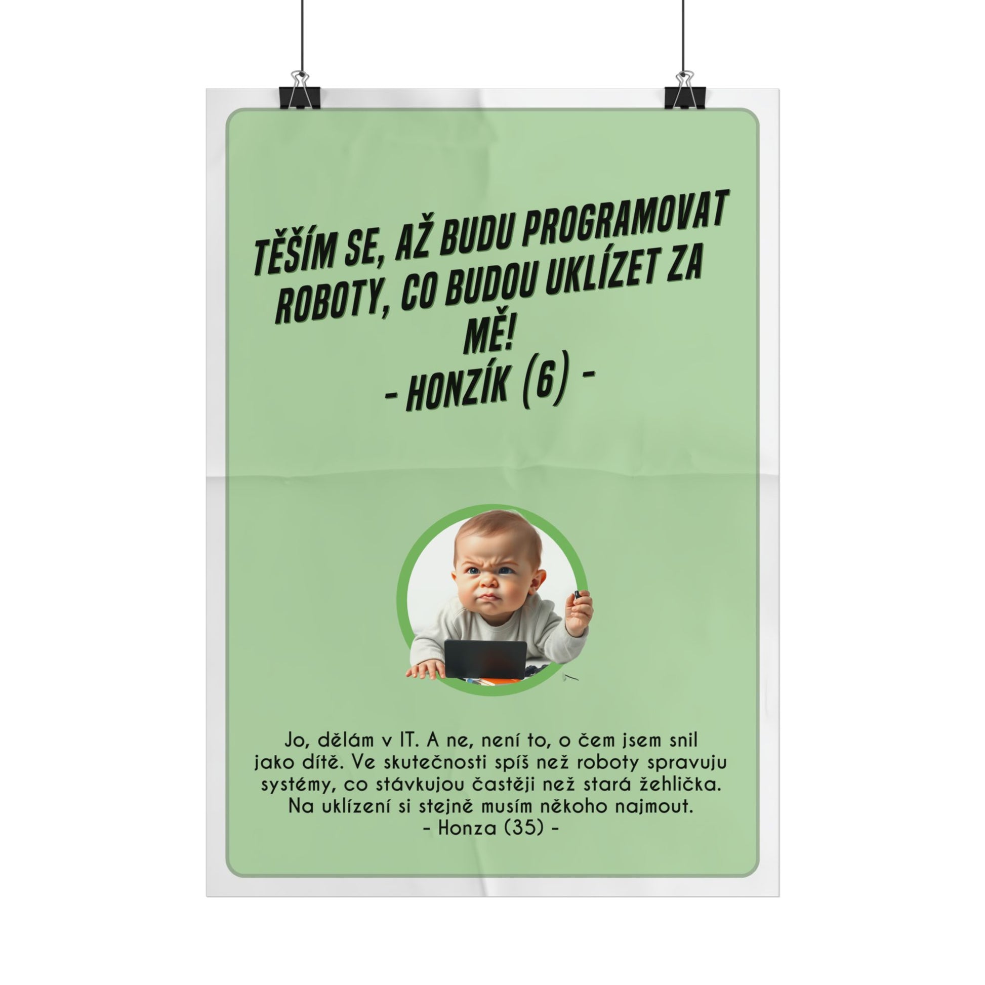 Vraťte se do dětství, kdy jste věřili, že jednou budete vládnout robotům jako Gandalf vládne serverům. Realita? Rozbité servery a stres horší než deadline v pondělí ráno. Sladké sny se změnily v každodenní boj se systémy, které se raději sesypou. Takže ta představa, že místo úklidu vytvoříte technologickou armádu? Ha, raději si najměte někoho na mytí oken! Tento plakát A3 je ideálním dárkem pro každého vývojáře, který ocení trochu humoru na stěně.