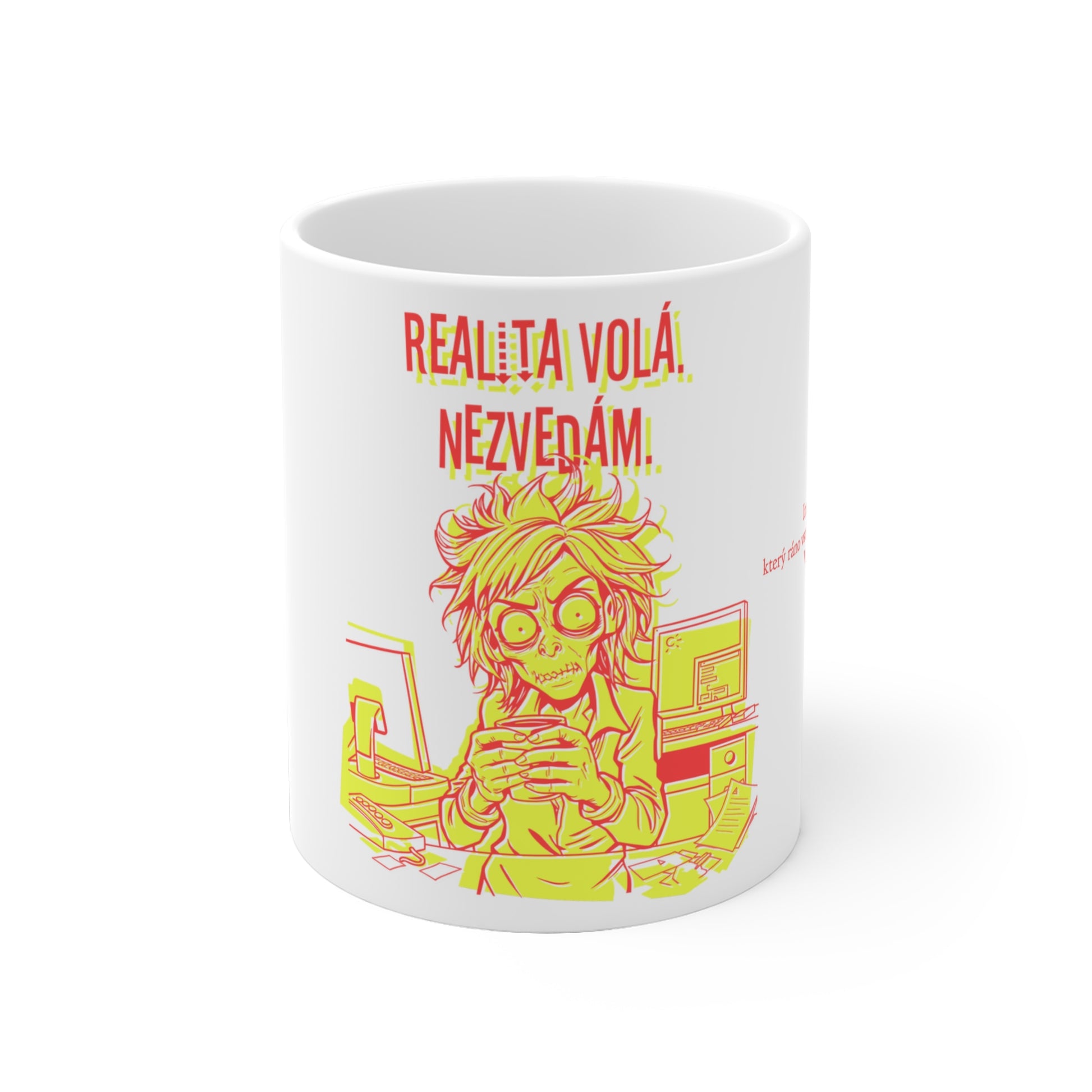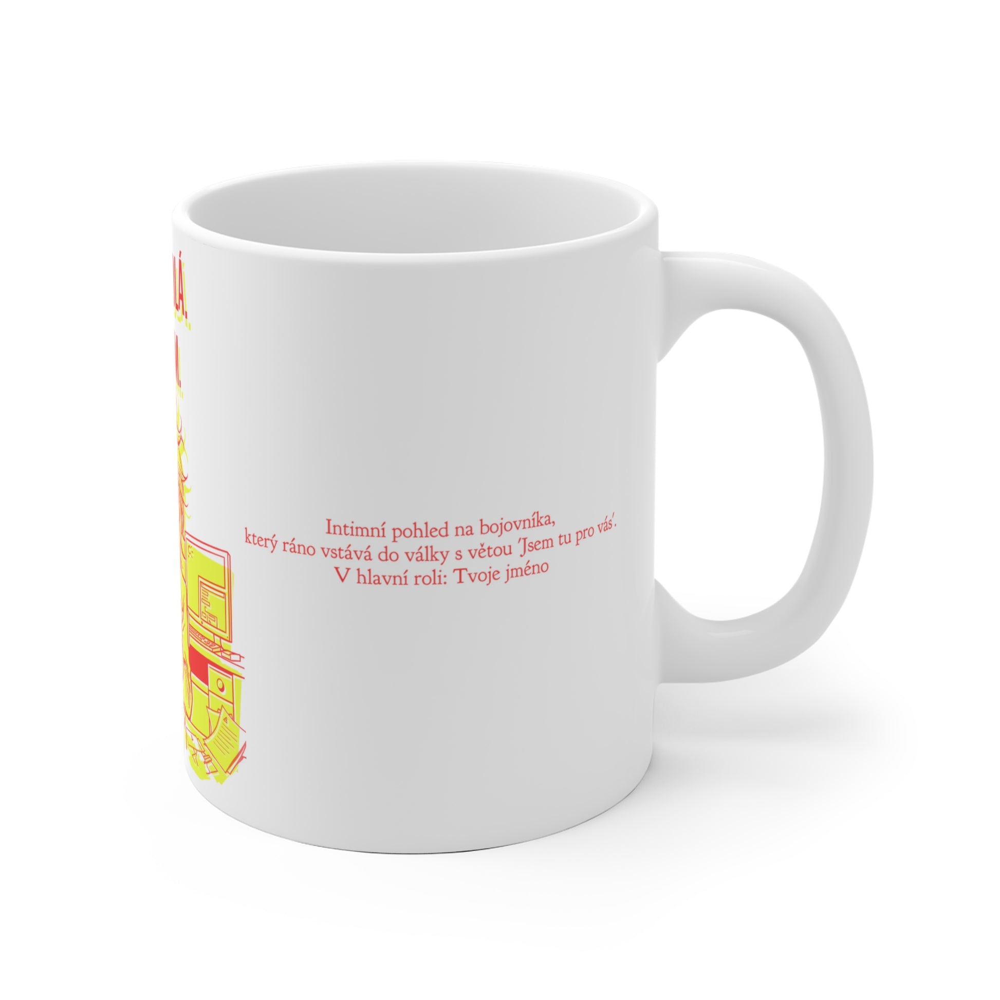 Začni svůj den s hrnečkem, který tě připraví na boj. Jakmile naskočí pohotovost, připomeň si, že jsi ten hrdina v pyžamu, co tato válčiště neúnavně korzuje. Intimní pohled na bojovníka, který ráno vstává do války s větou "Jsem tu pro vás," tě bude denně podporovat v rohu kanceláře. Buď kamarád, ne postrach – někdy je černá káva jediná věc, která tě udrží při životě. Ideální hrnek pro zákaznickou podporu nebo jako dárek pro někoho, kdo se v této roli vyžívá.