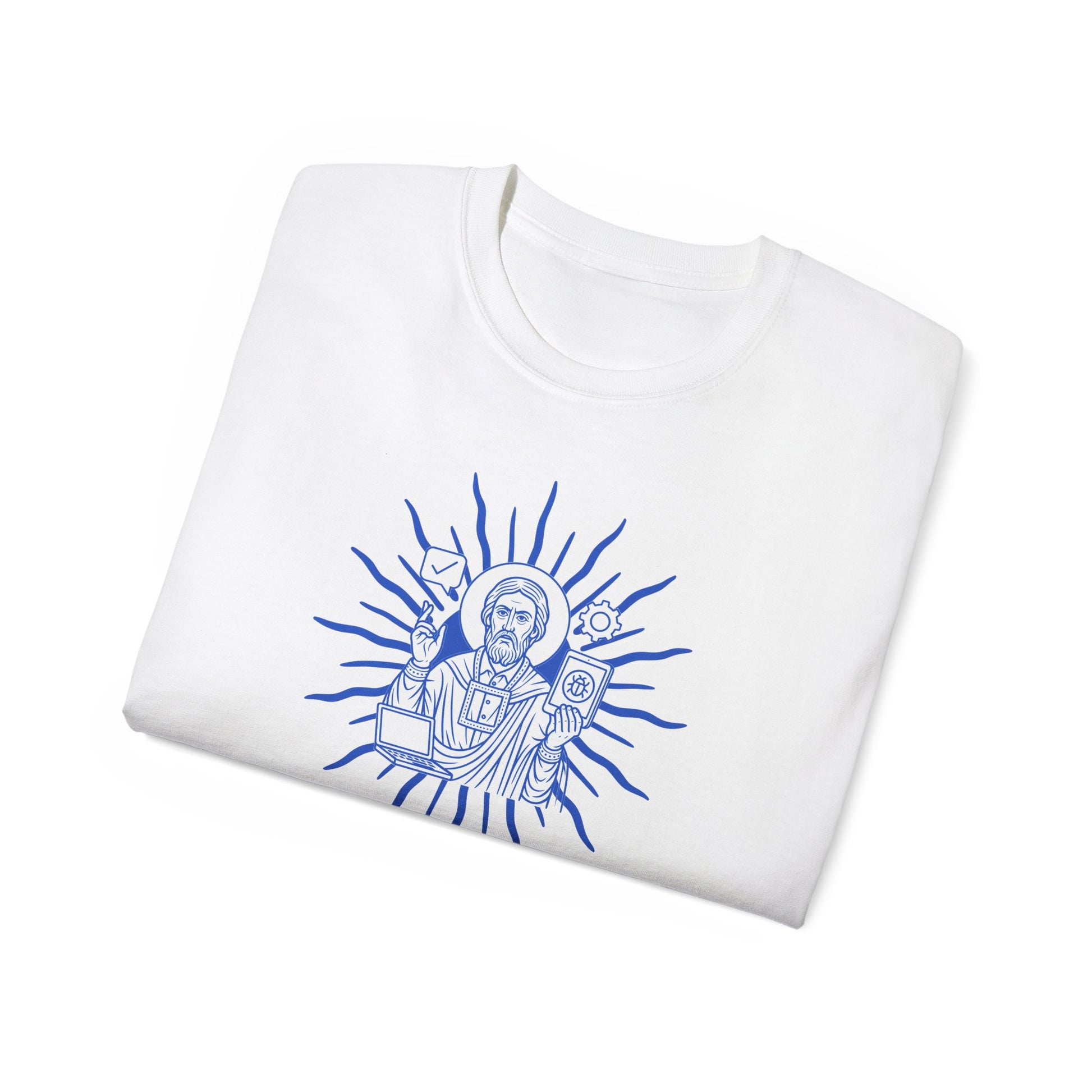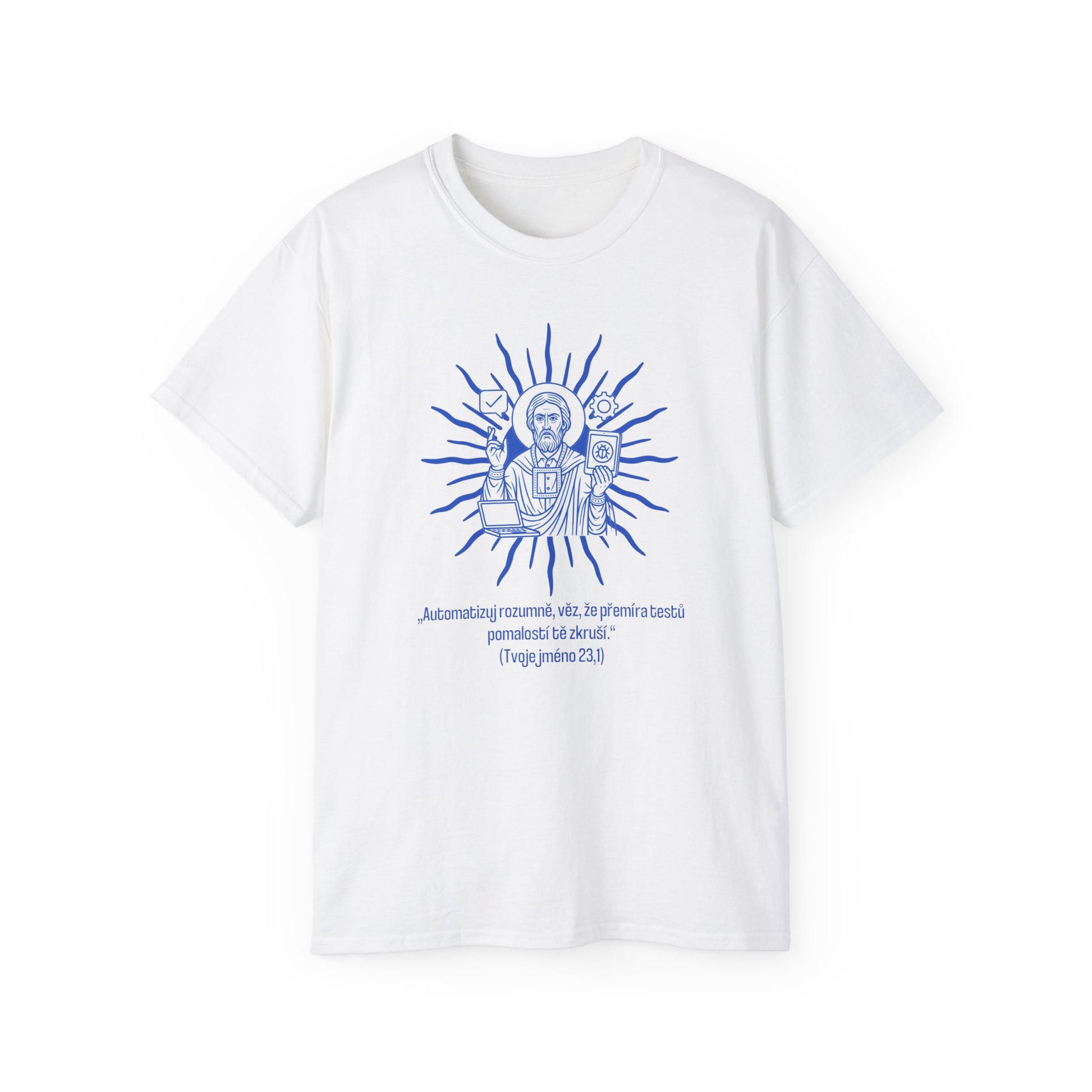 Náš svatý příteli, oblékni se do moudrosti svatých testerů! Kdo by si pomyslel, že zrovna ty, pranýřovač nekonečných smyček a mistr automatizace, najdeš duchovní radu na svrchní části svého těla. 'Automatizuj rozumně, věz, že přemíra testů tě může zdržet.' Ano, příteli, to je rada stejně stará jako tvůj poslední bug report a stejně hluboká jako noční deploy na ostré. Oblékni naše tričko a dej světu najevo, že svatá trpělivost je nad všechny testovací skripty.