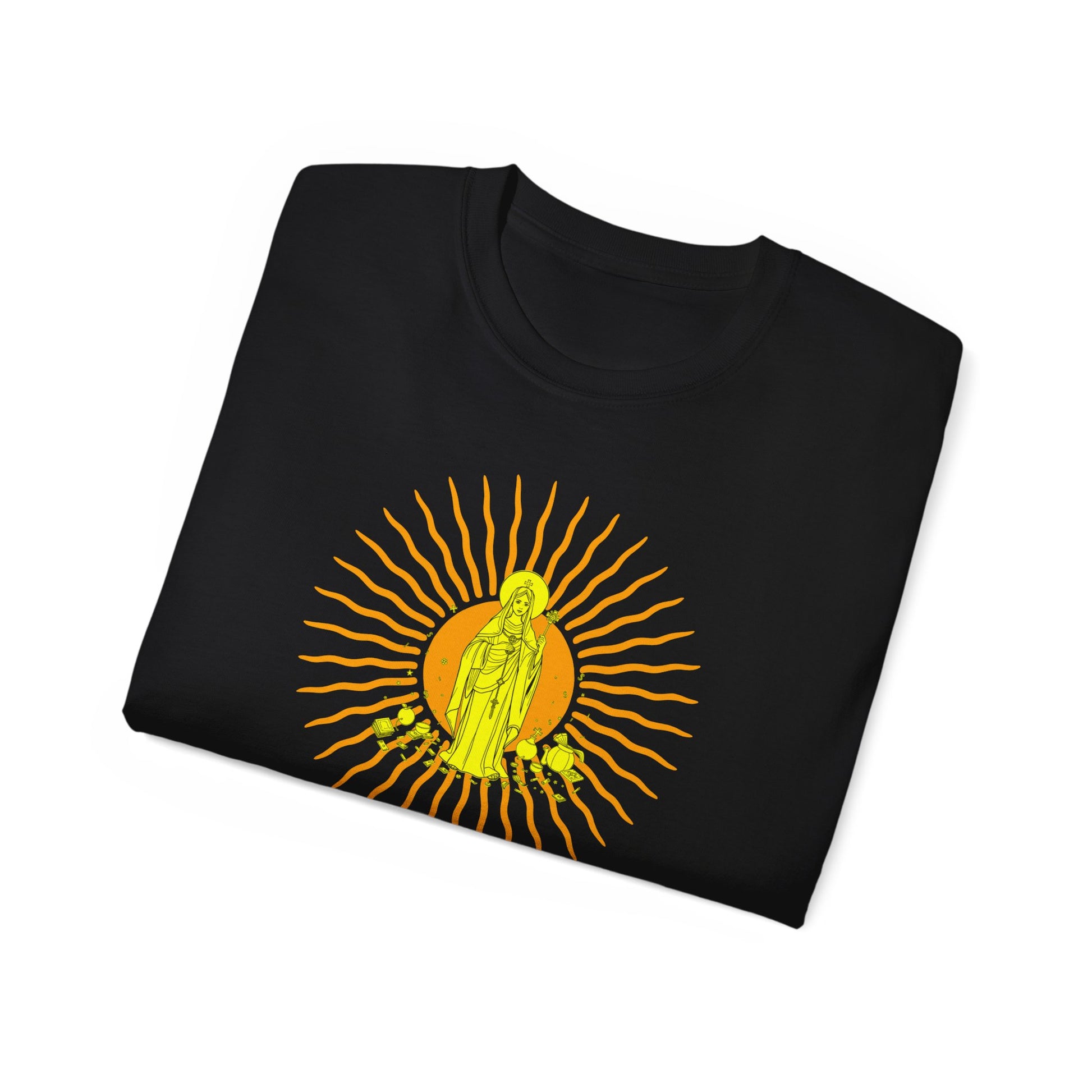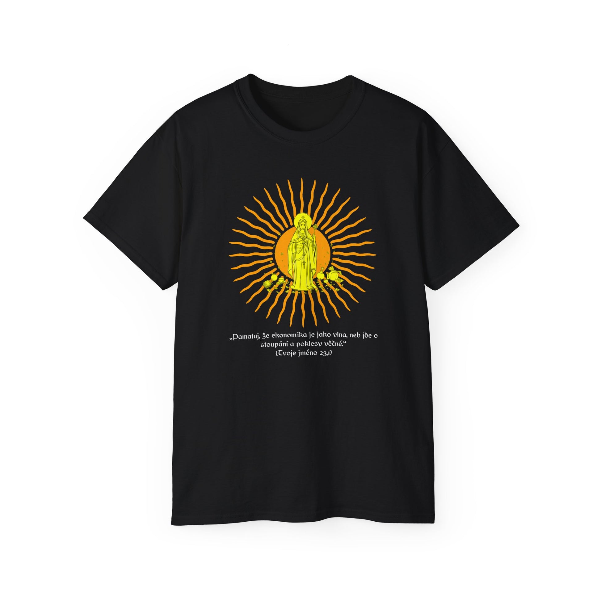 Hledáš svatou pravdu v grafu HDP? Toto tričko s posvátnou postavičkou ti připomene, že ekonomika je sice jako boží mlýny, ale melou docela rychle. Povinná výbava do kanceláře nebo pro práci z domu. Tak trochu svatoušek mezi tričky.