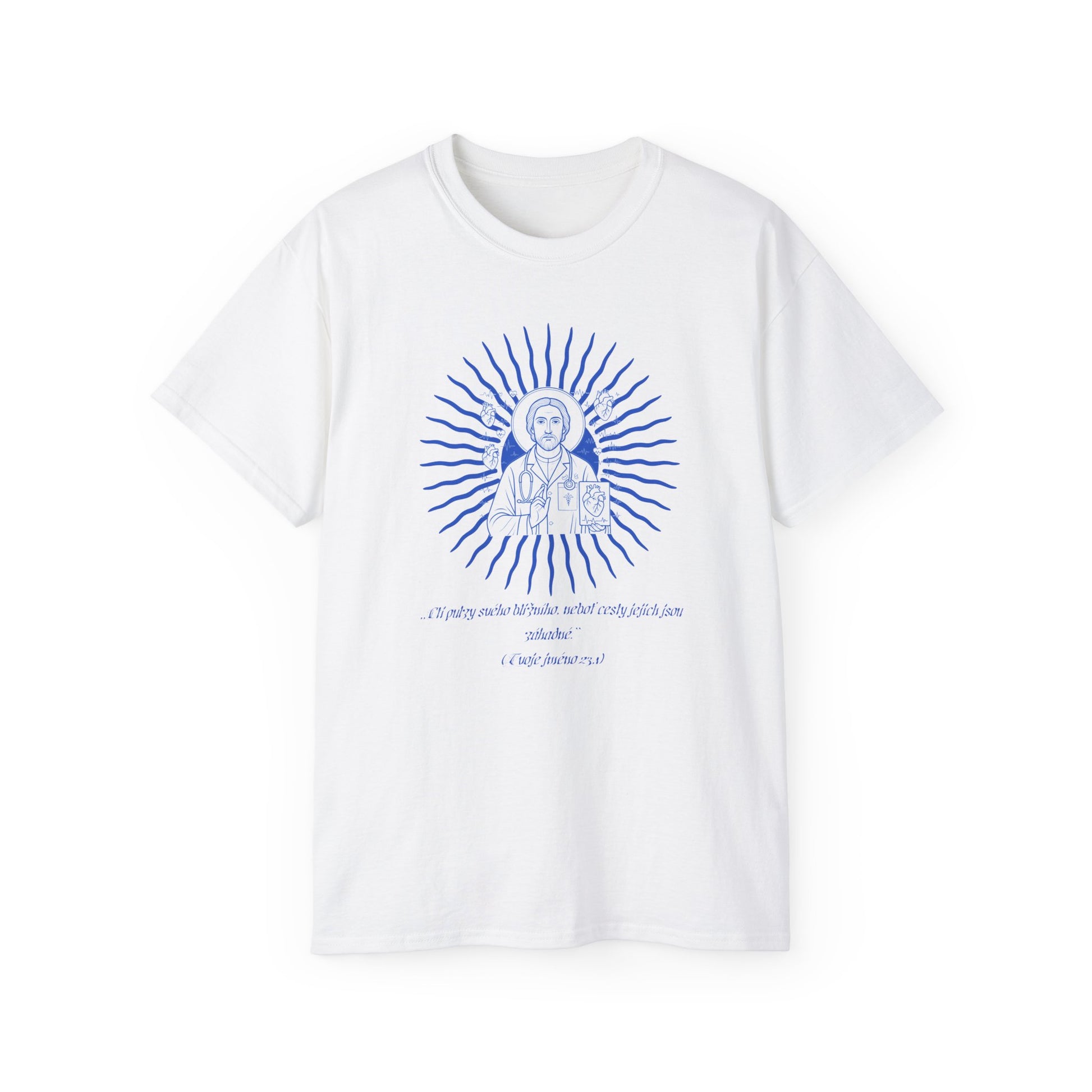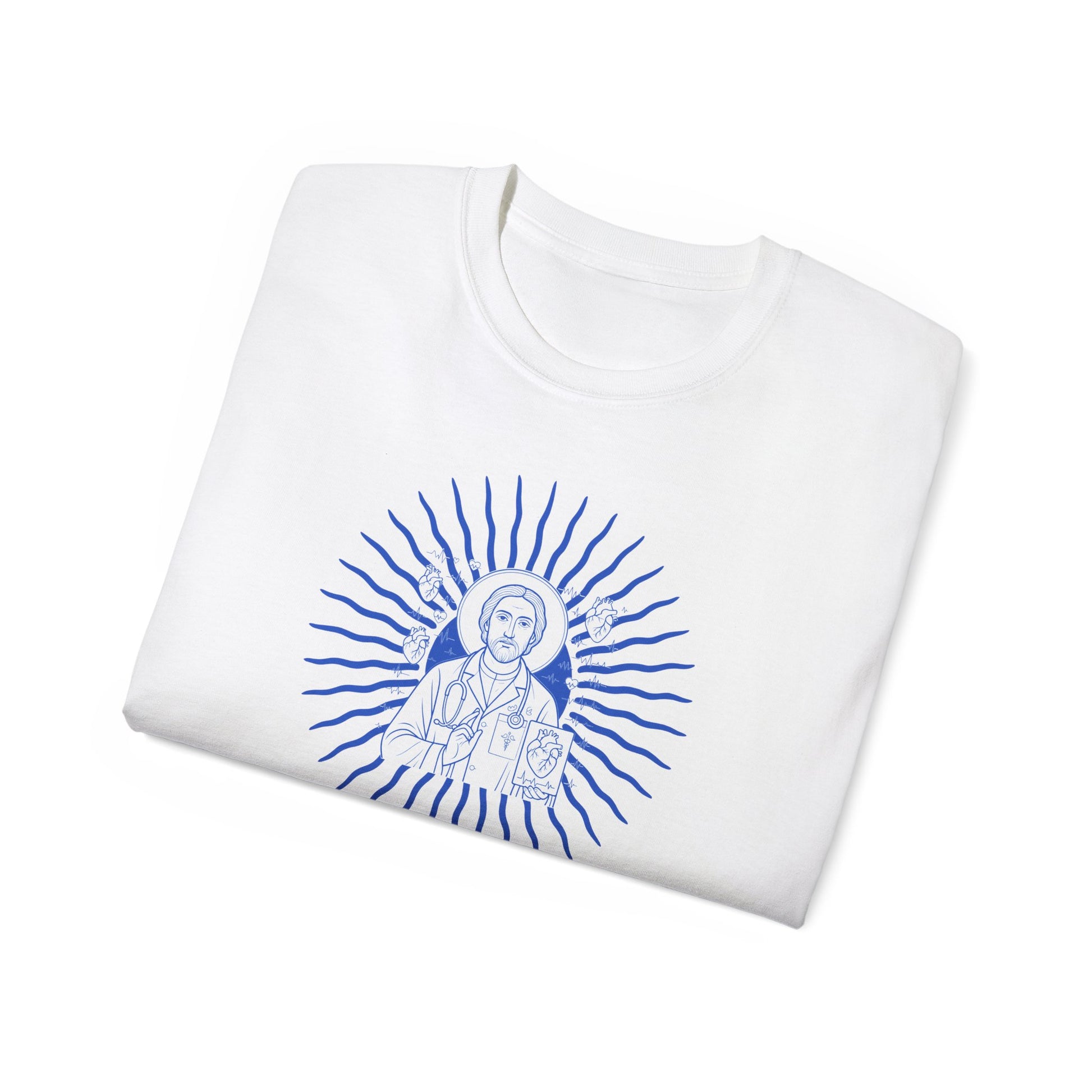 Hej, doktore s velkým K, tady je tvoje nové svaté tričko, které tě provede každou směnou. Na hrudi má moudrost jak z kostela: ‚Cti pulzy svého bližního, neboť cesty jejich jsou záhadné.‘ Je to takový malý boží vtípek, který krásně spojuje to, co děláme každý den, s něčím vyšším... nebo tak něco. Světec na tričku ti kryje záda a dodává tomu celému atmosféru, že i při resuscitaci jsi vlastně ve spojení s něčím posvátným.
