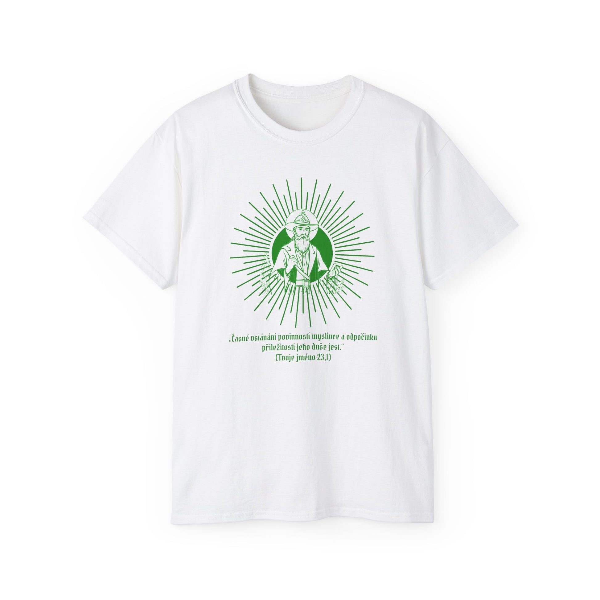 Prostě si to představ. Ty, tohle tričko a svatý svitek přímo na hrudi. Ano, sen všech myslivců dostat se na úroveň mentora lesa, další stupeň zasvěcení. Trocha ironie, trochu svatého klidu na lovu. Ale žádná panika! Když usneš, svatý na tričku stejně bdí nad revírem za tebe.