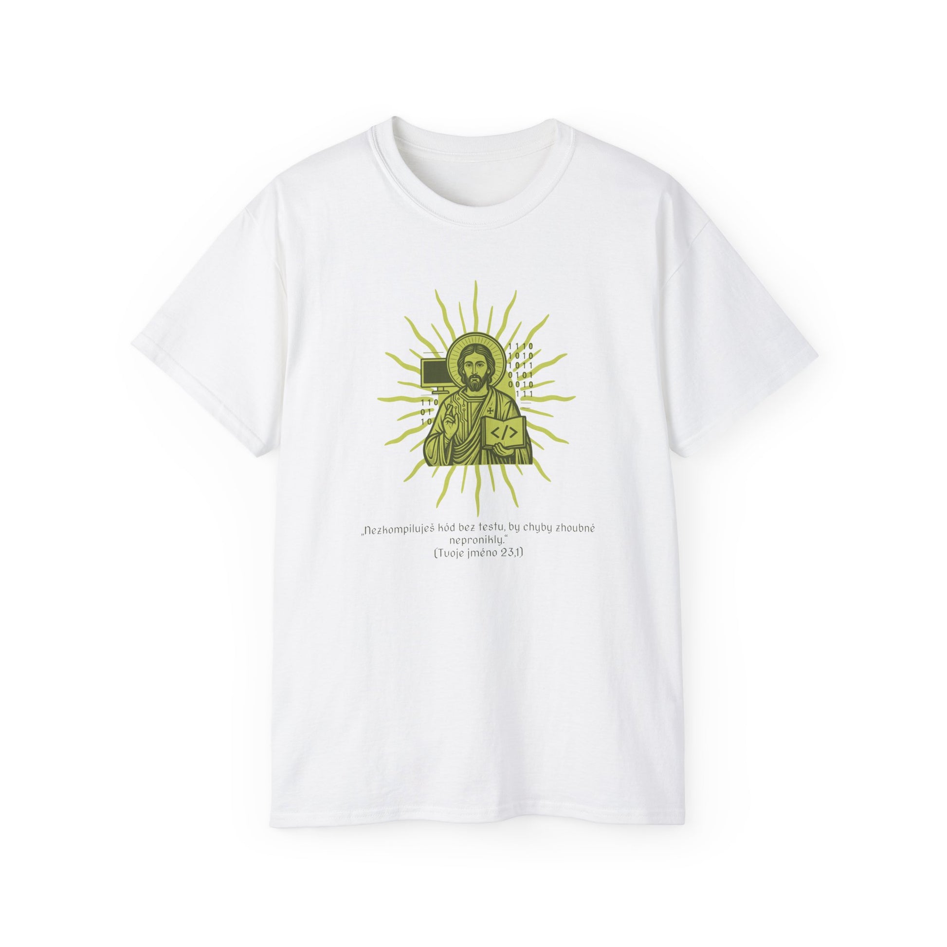 Hej kámo, jestli si chceš udržet čistou karmu kódu, pořiď si tohle tričko! Stylová svatá postava tě přímo přikáže: „Nezkompiluješ kód bez testu, aby chyby zhoubné nepronikly.” Skvělé na každodenní zachraňování světa IT od bugů. Neboj se, v tomto trikotu budeš svatější než server, který nikdy nespadne. Toto tričko je ideálním dárkem pro programátora nebo jako tričko pro programátory, kteří chtějí stylově vyjádřit svou vášeň pro kódování.